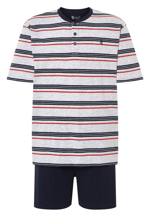 Set de pijama corto moderno de hombre de verano con parte de arriba a rayas negras y rojo sobre gris. Edición "Essentials", confeccionado en punto de 160gr/sqm 100% algodón, que otorgan gran suavidad, color brillante y resistencia a la rotura. Fit regular, con el mismo diámetro en las mangas y perneras, de tallaje holgado. Un pijama cómodo y fresco perfecto para noches calurosas. Parte de arriba de manga corta con cuello tapeta. Pantalón corto liso marino con dos bolsillos laterales a la altura de la cintura y sin bragueta.